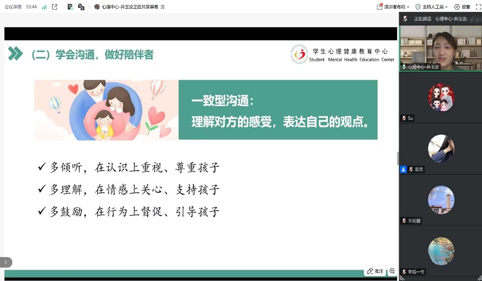 活动伊始,山东建筑大学心理健康教育中心教师井玉汝为大家讲授心理健康第一课,从当代大学生的心理发展特点切入,深度剖析了大学新生的心理状态与常见困扰,引导家长识别孩子的心理信号,呼吁家长主动沟通、信任陪伴,与学校携手共护学生心理健康。