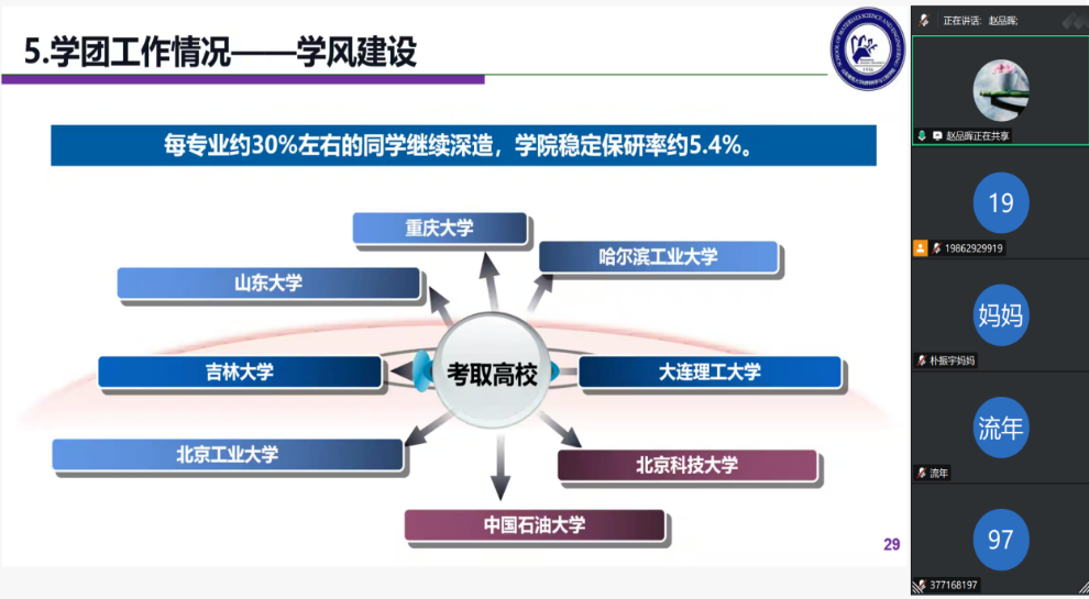 为增进新生家长对院校培养体系的了解,搭建良好的家校协同育人桥梁,9月11日,材料科学与工程学院线上召开2025级新生家长会暨心理健康第一课。学院党政领导班子成员赵品晖、侯振华,教学办主任康学良,学工办主任邹仲平,团委书记薛苏,校心理健康教育中心教师井玉汝,全体新生辅导员以及学生家长等400余人参加活动。