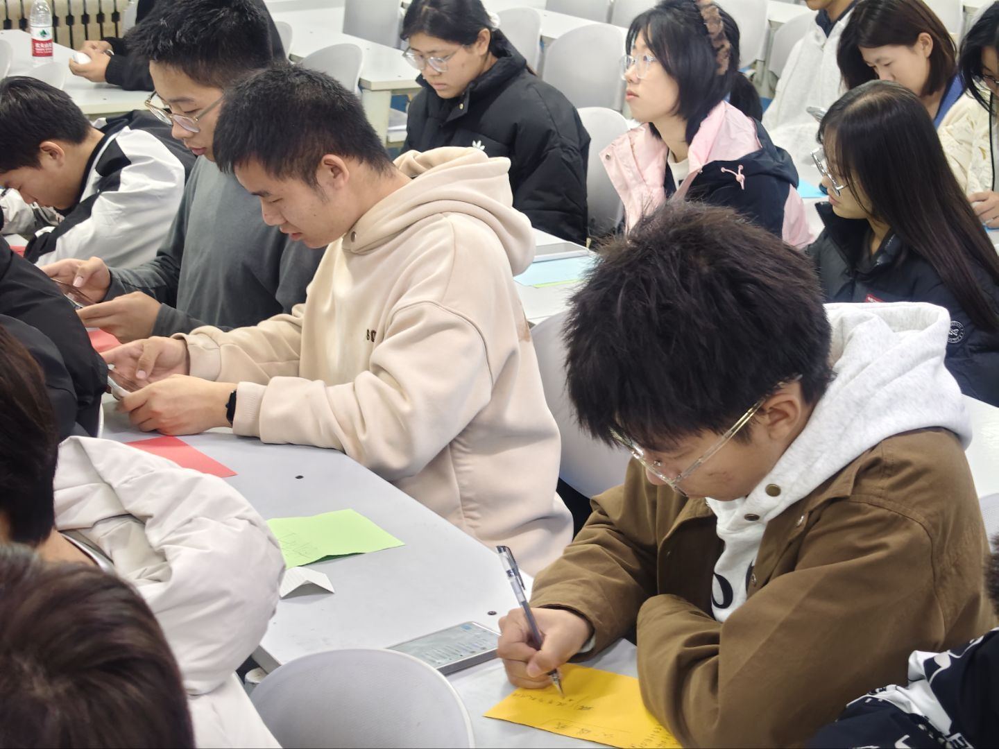 活动尾声,主持人引导同学们设立“小而具体”的生涯探索目标,发放“行动卡”让大家填写未来3个月的具体计划,如“参加1次专业讲座”等,避免空泛的长期目标。最后,主持人总结活动核心收获,强调思政引领对生涯发展的重要意义,鼓励新生以工匠为榜样、以家国为己任,在成长路上稳步前行。