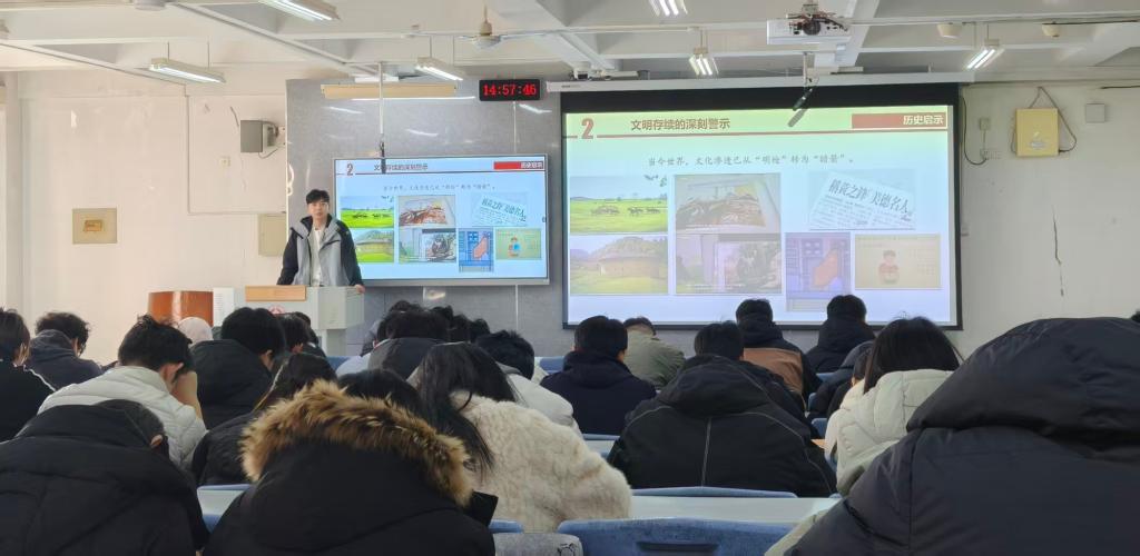 宣讲会上,辅导员孙硕以文化安全为核心,立足高校育人职责,从历史、现实、实践维度展开系统讲解,通过盛唐文明的繁荣景象与近代文化浩劫的沉痛对比,揭示文化安全是民族发展的精神命脉,通过传统文化标识争抢等鲜活案例,剖析文化安全领域面临的复杂挑战,并围绕文化自信培育、科技赋能传播等基础路径,引导青年学子做中华优秀传统文化的传承者和文化安全的坚定捍卫者。