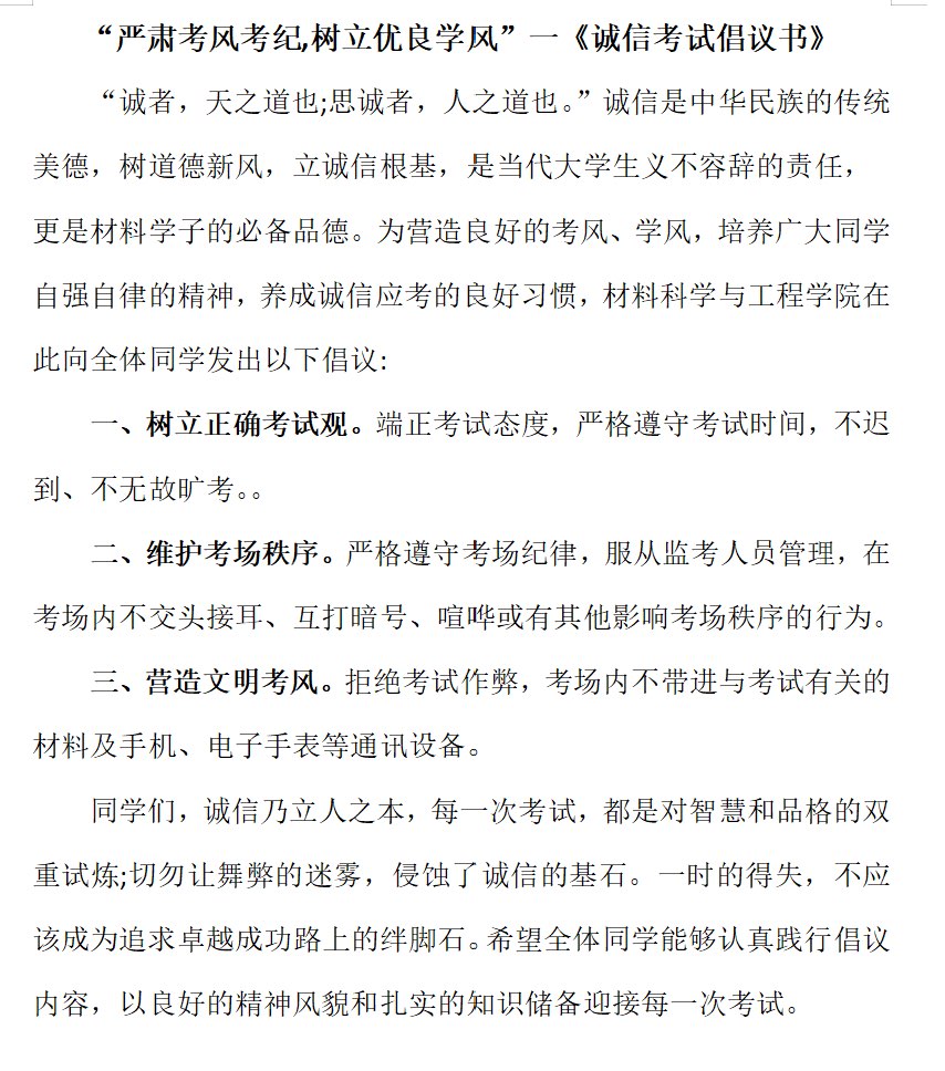 材料科学与工程学院始终坚持“资助与育人并重”的工作理念,将诚信教育贯穿资助工作全过程。此次“诚信考试,资助育人”系列活动,既是对考风考纪的强化整治,也是资助育人工作的深化延伸。下一步,学院将继续健全完善资助体系,把诚信教育、感恩教育融入学生培养各环节,助力学生成长为品德高尚、学识扎实、勇于担当的新时代青年。