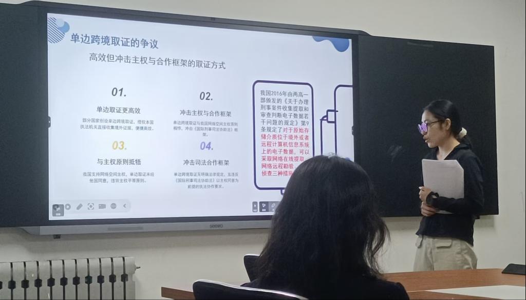 主讲人李倩文的《数据控制者跨境取证模式研究》报告聚焦于跨境取证,旨在探索数据控制者跨境取证模式之下的中国应对之策。她指出在当今社会,一方面为应对数字化犯罪问题,电子数据的信息共享度将成为跨境取证的关键证据;另一方面还要面对传统司法协助流程复杂和单边取证冲击主权等问题。因此,中国在此时的应对之策要明确管辖模式立场和探索多元取证模式来加强自身能力。