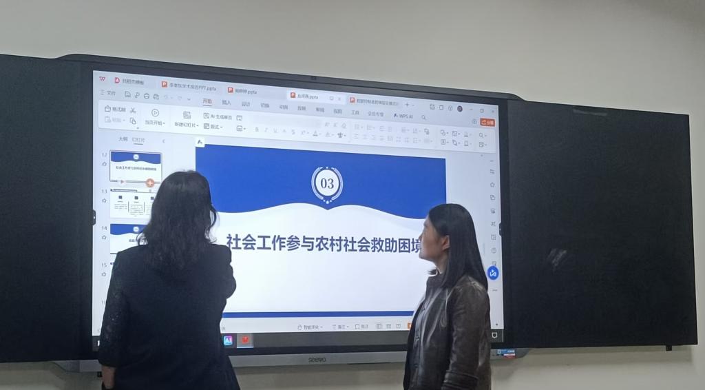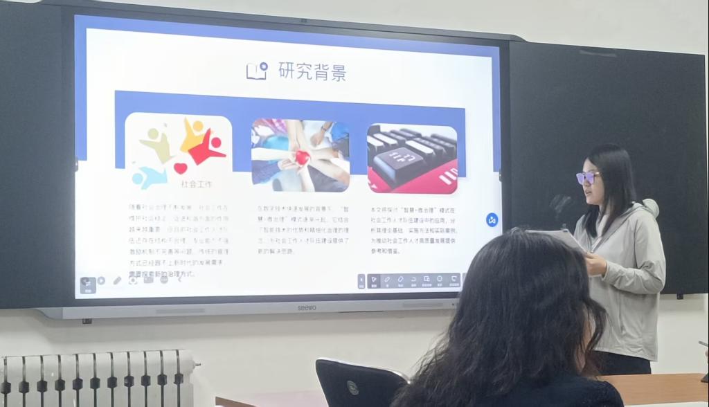 主讲人杨婷婷的汇报题目为《社会工作人才队伍建设的“智慧+微治理”创新模式》,她指出目前社会工作人才队伍不合理的问题,即当前社工人才队伍虽逐步壮大,但存在结构不合理、职业吸引力低、教育与实务脱节、管理机制不完善等困境。在此之下,“智慧+微治理”模式有望成为解决思路。在学术汇报中,她解析该模式理论框架,提出智慧治理以数据驱动实现智能精准,微治理聚焦微观场景,二者互补耦合,共同发展。