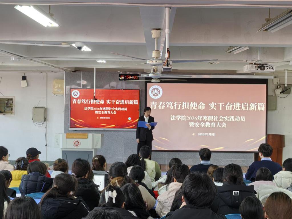 为引导青年学子在实践中受教育、长才干、作贡献,1月8日,法学院于外文楼311教室举办2026年寒假社会实践动员暨安全教育大会。法学院党委副书记于志云、团委书记王小兰及辅导员孙琳出席会议,各实践团队负责人及成员参加会议。社会实践中心彭佳荟主持本次会议。