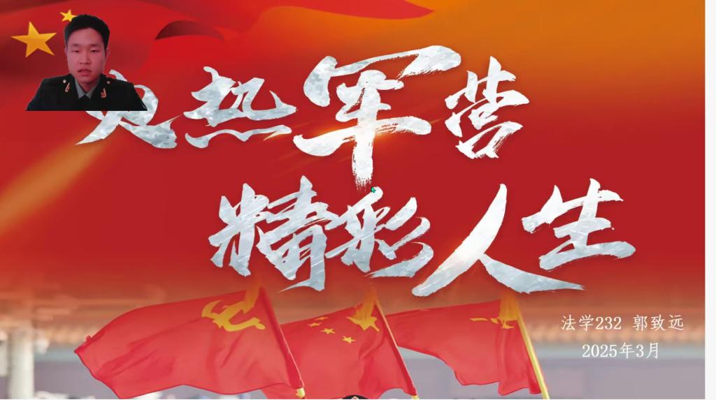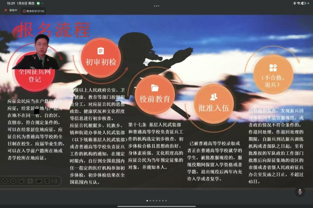 为响应国家征兵号召,鼓励青年学子投身国防建设,1月8日,法学院举办征兵入伍线上宣讲会。活动邀请退役复学大学生郭致远主讲,解读参军政策、分享军营经历,吸引全院众多学生参与。