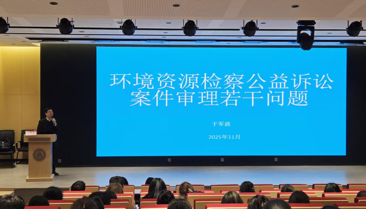 讲座中,于军波从环境资源检察公益诉讼的理论溯源、审理法院、与环境民事公益诉讼的关联等方面全面系统介绍了环境资源检察公益诉讼案件的审理现状。在法治理论层面,他强调,环境资源检察公益诉讼是统筹推进生态环境与高质量发展协同共进、深入贯彻新时代环境司法理念、服务保障生态文明建设大局的重要举措;在司法审判层面,他指出,应当注重明确环境资源检察公益诉讼的请求权基础,妥善解决生态环境损害赔偿金的执行与管理问题。此外,于军波重点解读了全国环资审判有重要影响力案件。一是全国首起大气污染公益诉讼案,该案获评全国环境资源审判典型案例;二是全国首例预防性放射污染检察公益诉讼案,该案获评全国指导性案例,对全国环境资源审判工作具有重要示范意义。在现场互动环节,于军波就“环境资源检察公益诉讼与行政诉讼的关系”等热点话题与同学们展开深入交流,耐心解答学生的疑问。