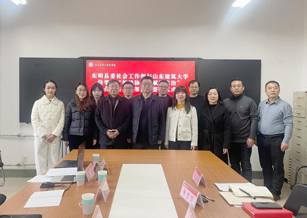 12月29日,山东建筑大学法学院与东明县委社会工作部合作共建框架协议签约仪式在法学院会议室举行。东明县委社会工作部部长、县委“两新”工委书记张付群,东明县委社会工作部副部长袁德宽,济南市东明商会会长周杨,济南市东明商会秘书长陈旭峰,法学院院长朱宝丽及法学院部分班子成员参加活动。