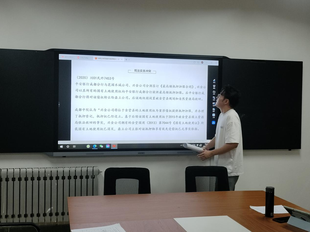 主讲人陈昊炜以《闲置土地收回权与抵押权冲突与协调的法律机制研究》为题进行汇报,围绕政府在无偿收回闲置土地过程中与既有抵押权之间产生的法律冲突展开分析。他指出当前司法实践中对此存在不同认定,部分判决支持抵押权存续,亦有判例认为抵押权随土地收回而消灭。在规范层面,对《闲置土地处置办法》与《民法典》相关条款的适用冲突进行了梳理,并尝试从物权追及效力、财产权相对消灭等角度提出初步协调思路。