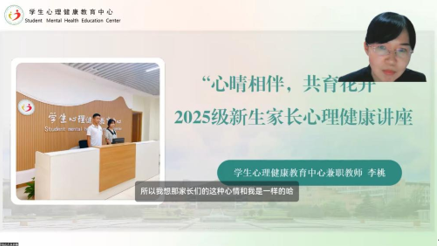 为助力2025级新生更好地适应大学生活,着力培育学生积极向上的健康心态,9月7日,法学院联合学校心理健康中心开展“心晴相伴,共育花开”2025级新生家长线上心理健康讲座。学校学生心理健康教育中心兼职教师李桃主讲,2025级全体新生家长、新生辅导员参加。