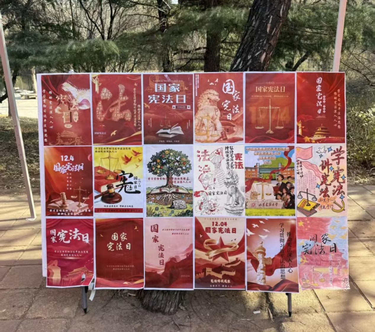 12月4日国家宪法日当天,优秀作品展在映雪长廊启幕。晨光映照下的海报吸引师生驻足,法学院志愿者现场讲解作品法治内涵,结合画面解读宪法原则,让观展成为沉浸式学习体验。