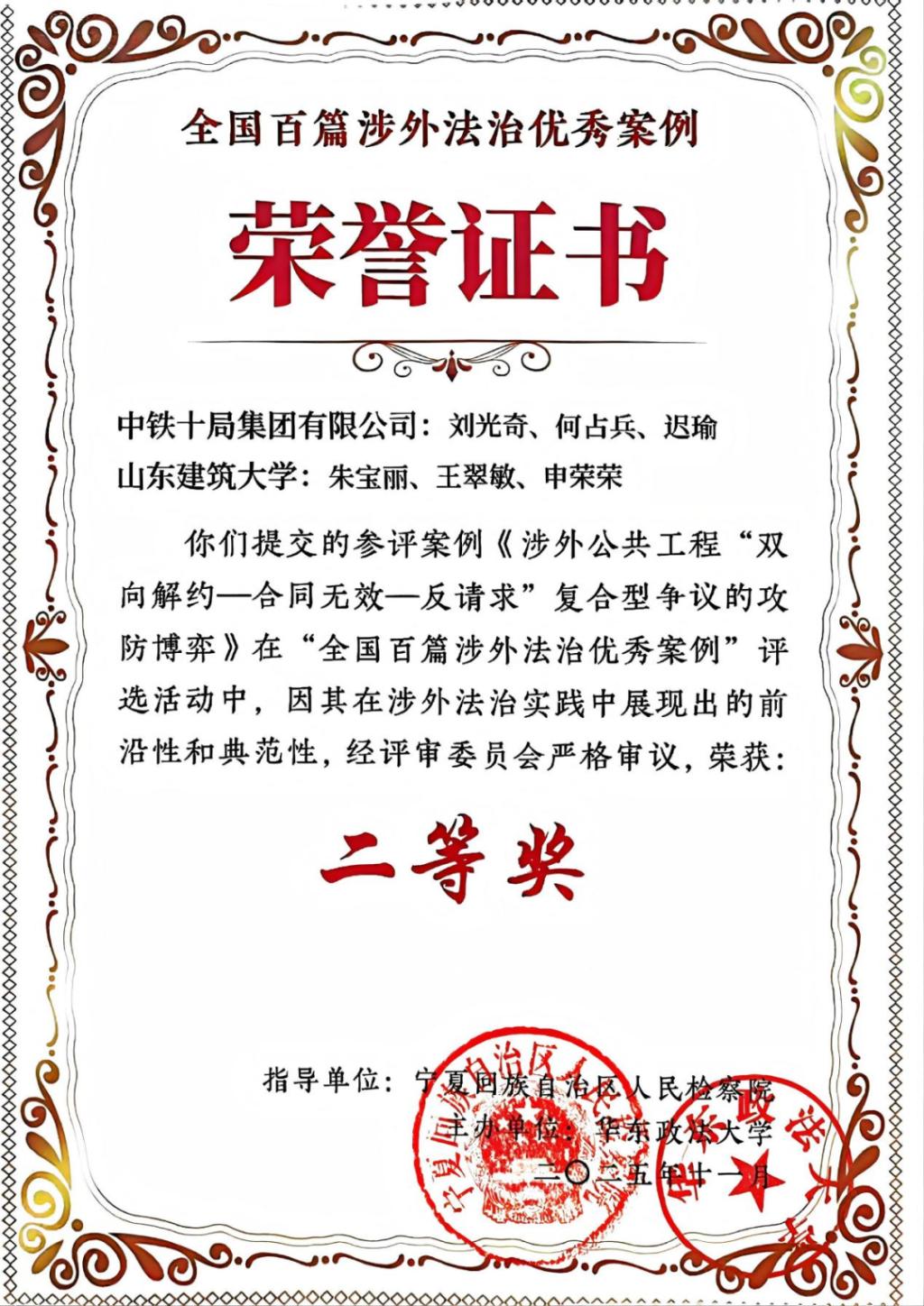 我院《一带一路涉外工程法治人才培养典型案例》和参与编写的《涉外公共工程“双向解约-合同无效-反请求”复合型争议的攻防博弈》两项案例获评二等奖。