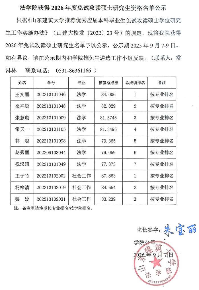 法学院获得2026年度免试攻读硕士研究生资格名单公示