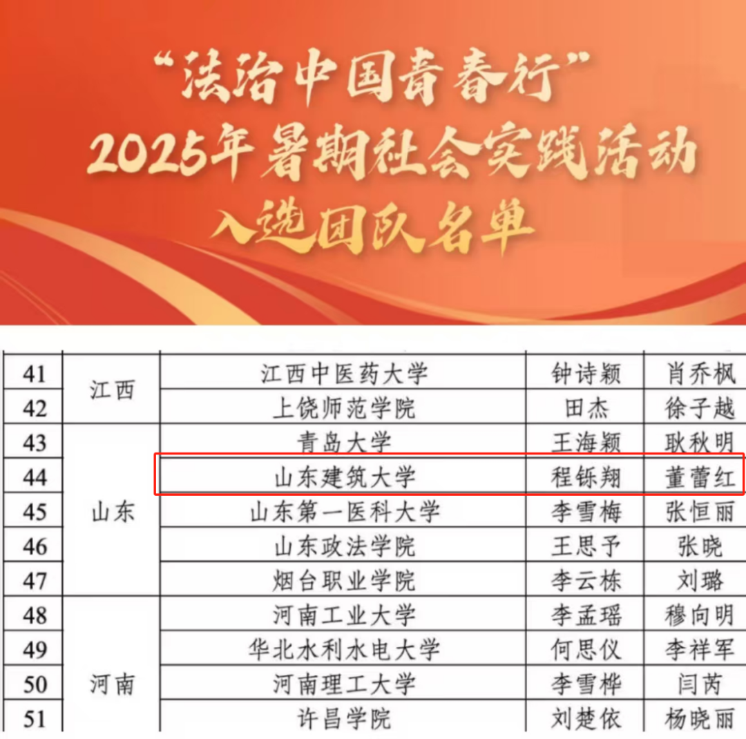 为深入贯彻党的二十大和二十届二中、三中全会精神,动员广大高校学生投身基层法治实践,共青团中央维护青少年权益部联合司法部普法与依法治理局、公安部禁毒局等部门开展“法治中国青春行”2025年暑期社会实践活动,经评审,我校由法学院董蕾红副教授带队,孙琳、王小兰、刘艳飞共同指导的“银发守护”实践团队成功入选。此次专项实践活动全国共有87支队伍入选,山东省有5支队伍入选。