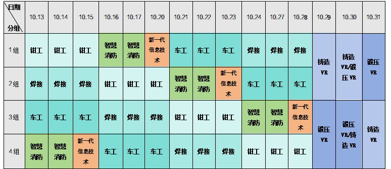 【5】实训老师安排:钳工:王昊 冯革新;焊接:赵杰、凃英明、崔敏;铸造VR:李洪营;锻压VR:张维娜; 车工:谢琛; 智慧消防:王丛雷、周亚莉,新一代信息技术:李晓峰。