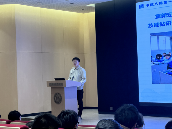 本次报告会邀请中建八局第一公司专业工程师、高级技师陈宇航来到现场,为师生讲述了他作为全国技能大赛金牌获得者、全国技术能手和齐鲁大工匠的奋斗历程。