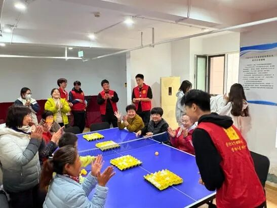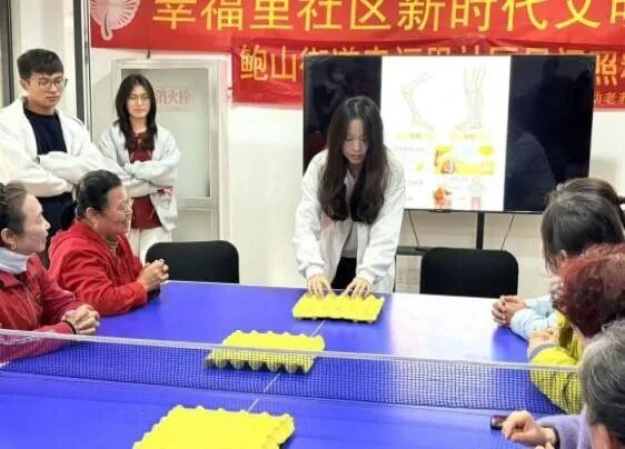 讲座后,趣味乒乓五子棋活动开展,志愿者用鸡蛋盒改造棋盘、备妥道具,老人两人一组竞技,按简单规则弹球连线决胜,现场欢声笑语、情谊升温。活动尾声,志愿者赠送艾草香囊,为老人们祈愿健康平安。