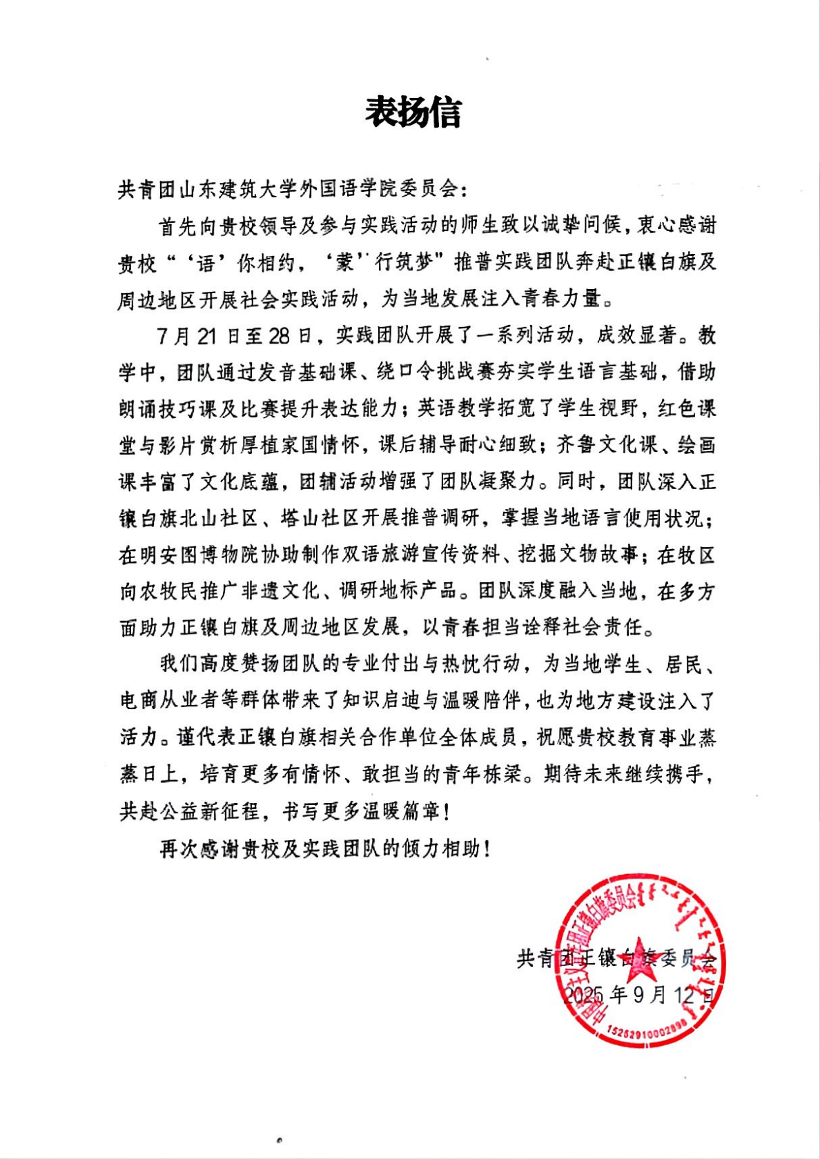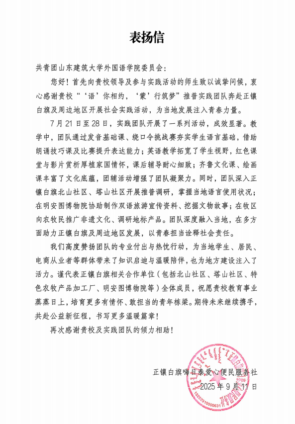 近日,山东建筑大学外国语学院“‘语’你相约,‘蒙’行筑梦”推普实践团收到来自内蒙古自治区正镶白旗嗨日泰爱心便民服务社及共青团正镶白旗委员会的表扬信,对我校学子在推普助力乡村振兴社会实践中的突出表现予以高度赞扬也是对我校实践育人成效的充分认可。