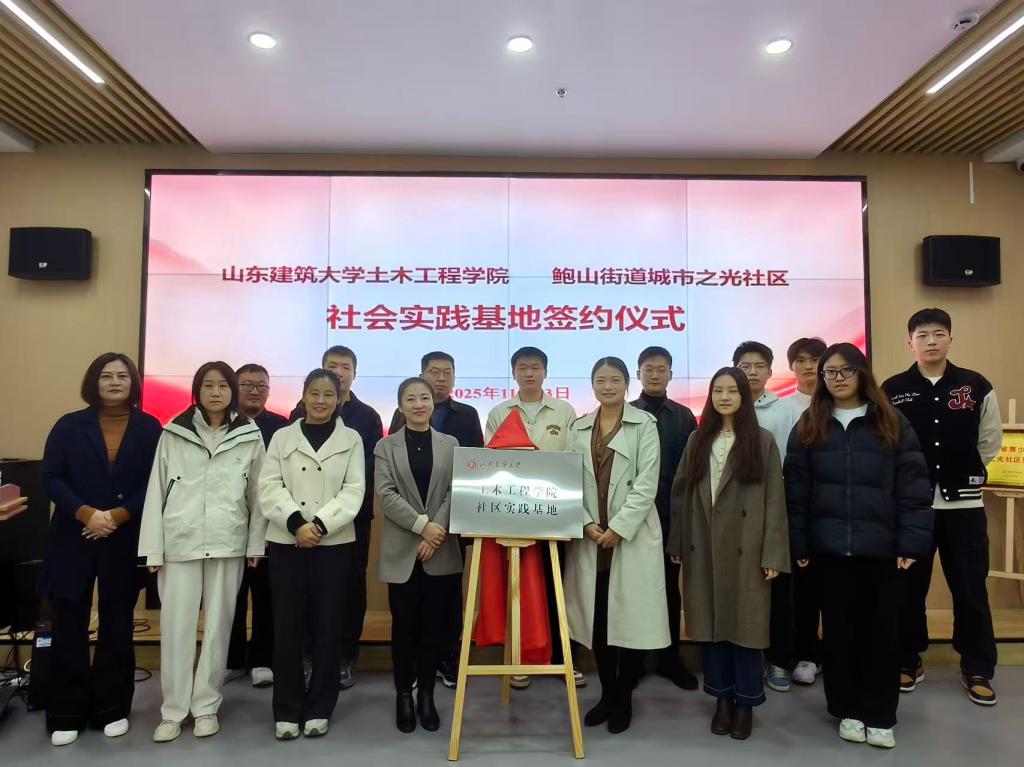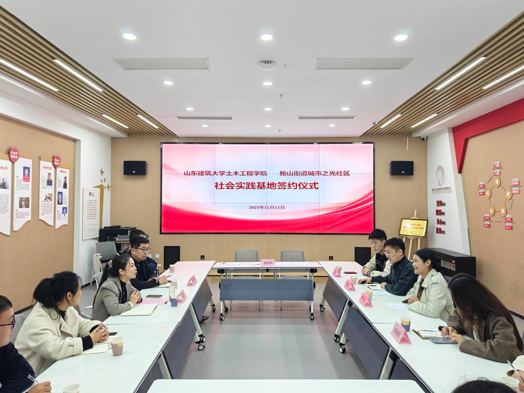 为深化校地协同育人,搭建“高校资源下沉、社区需求对接”的实践桥梁,11月13日上午,山东建筑大学土木工程学院与济南市鲍山街道城市之光社区“大学生社区实践基地”签约仪式。城市之光社区党支部书记、居委会主任曹佳主持仪式,山东建筑大学土木工程学院团委书记蒋衍玺、辅导员郭美虹、刘帅东及社区居民代表、学生代表共同出席活动。