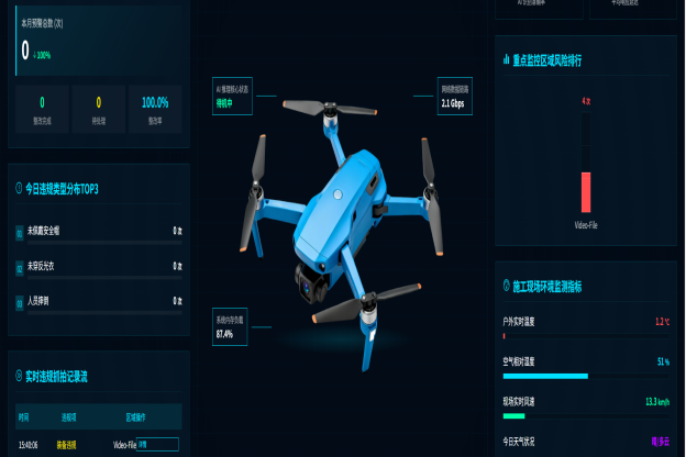 针对施工现场范围广、高空盲区多等监管难点,实践团队现场演示了无人机摄像技术在安全巡检中的应用。随着旋翼的轰鸣声,无人机腾空而起,将复杂的施工全景实时传回显示终端。团队成员讲解了如何利用高分辨率影像,进行安全帽反光衣穿戴情况及人员摔倒情况的抓拍,展现了现代化视觉感知技术,在提升工地监管效率、降低人工巡检风险方面的巨大潜力。