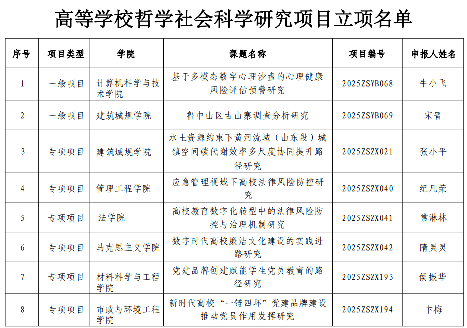 近日,山东省教育厅公布山东省高等学校哲学社会科学研究项目立项名单,我校获批8项,其中一般项目2项、专项项目6项,立项率89%,实现新突破。