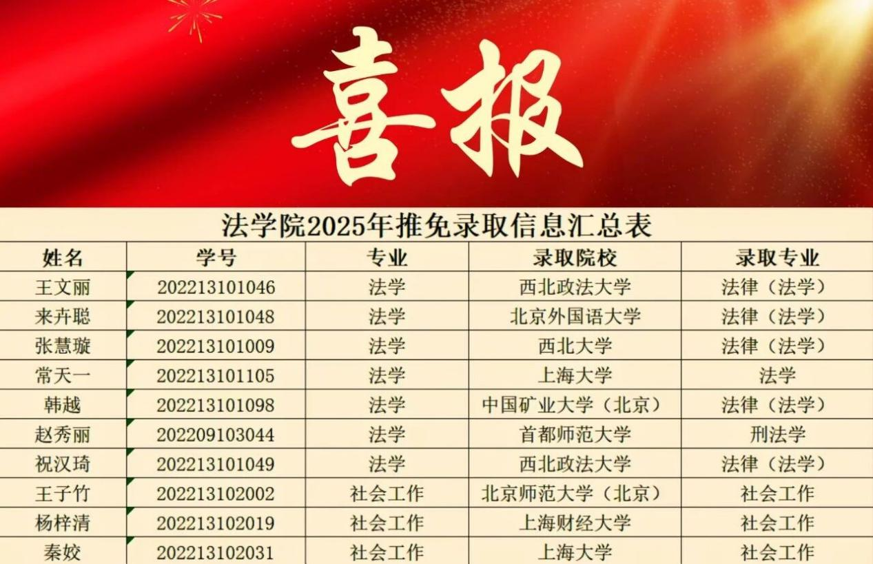 此次推免佳绩的取得,为法学院人才培养工作注入了强劲动力。未来,学院将继续坚守高质量人才培养初心,不断完善法治人才与社会工作人才培养体系,汇聚教育教学资源,搭建更广阔的成长平台,助力莘莘学子在逐梦路上绽放光彩!