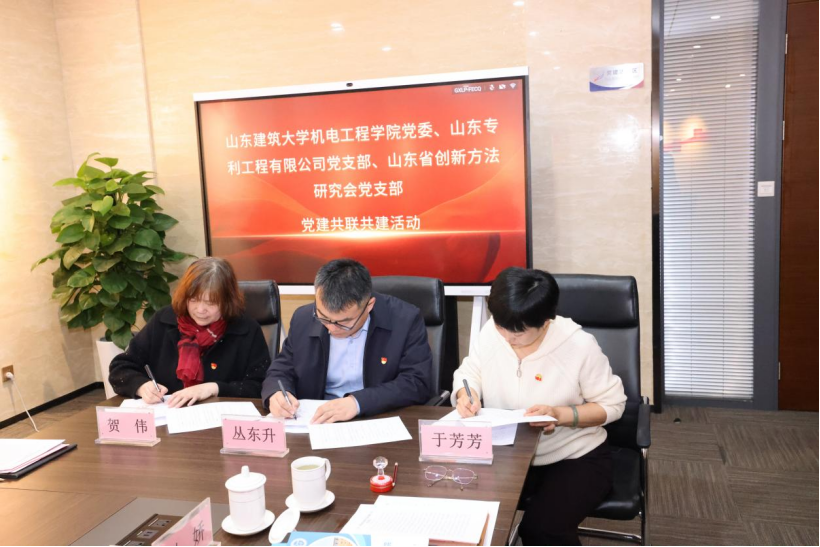 2025年11月5日下午,一场汇聚“高校--企业--学会”三方优势的党建共建活动在山东省知识产权公共服务平台成功举行。山东建筑大学机电工程学院党委、山东专利工程有限公司党支部、山东省创新方法研究会党支部携手构建“党建引领、跨界融合”的新范式,以“五联五建”为框架共同签署共建协议,开启“党建+创新”跨界协同的新篇章。