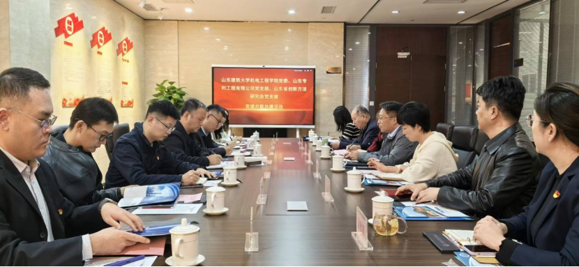 山东建筑大学机电工程学院党委书记李俊策、党委副书记丛东升,山东专利工程有限公司执行董事、总经理任尚军,山东省创新方法研究会党支部书记贺伟等15名党员代表出席会议。此次共建深度融合了高校作为创新发源地与人才输出地的科研优势、专利公司作为成果转化地与人才接收地的产业平台,以及研究会链接产学研的方法纽带与资源整合功能,形成了“源头创新-方法赋能-产业应用”的完整闭环,是“党建+”模式在推动产学研协同中的一次特色实践。