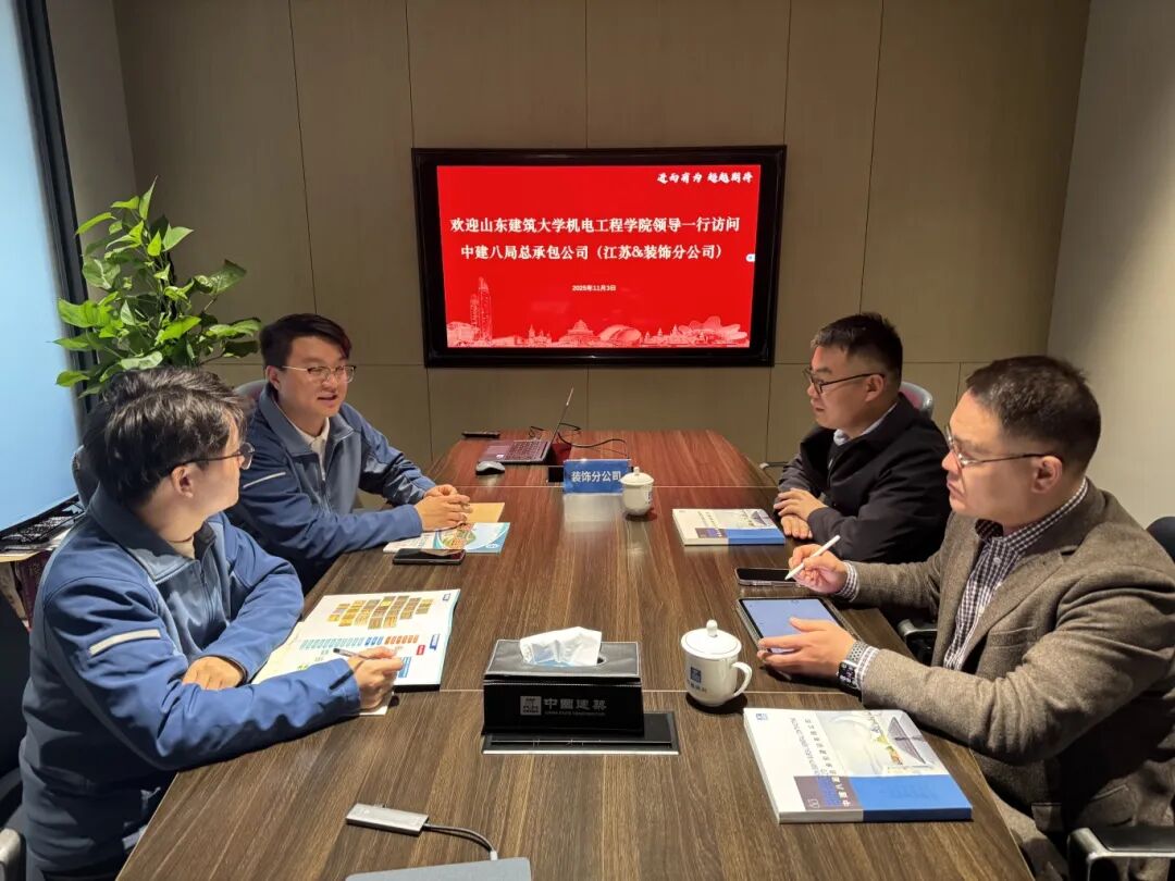 为更直观地了解企业文化和用人环境,当日下午,丛东升、张克森专程实地走访中建八局总承包公司。走访期间,学院一行参观企业展厅,了解企业发展历程、核心业务与未来规划,并与公司人力资源及技术部门负责人进行座谈。座谈会上,双方围绕学生实习实践基地建设、产学研项目合作、毕业生招聘等议题进行卓有成效的探讨,初步达成进一步合作的意向,为后续建立稳定长效的合作机制奠定坚实基础。