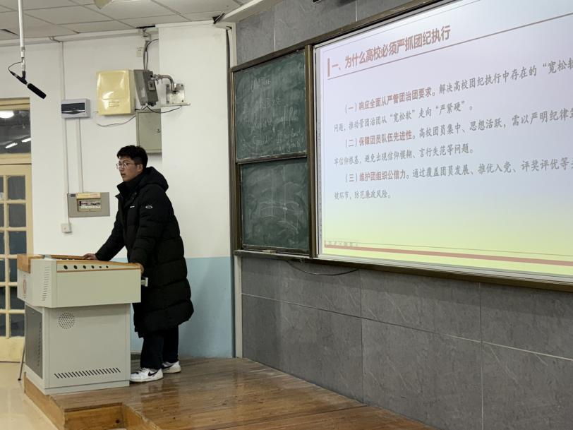 活动伊始,李铭伟强调了高校必须严抓团纪执行的重要意义,并阐述了严明团纪对落实全面从严管团治团要求、保障团员队伍先进性、维护团组织公信力三方面的深远影响。随后,他围绕《中国共产主义青年团纪律处分条例》中纪律处分的种类、适用情形、实施程序等核心内容,结合大学生的日常学习生活实际,对政治纪律、组织纪律、廉洁纪律等重点要求进行逐条解读,用通俗易懂的语言将条例条文转化为可感知、可遵循的行为准则。