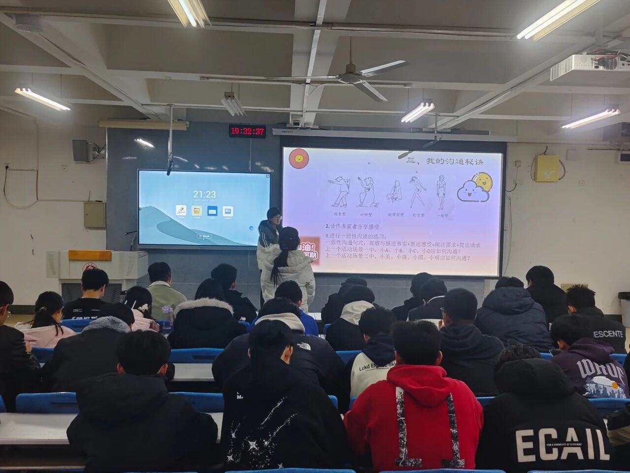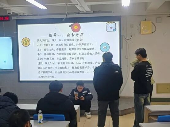 活动开始,“缘来有你”破冰环节迅速拉近了大家的距离。在轻快的音乐中,同学们用击掌、握手、微笑等方式相互问候,让陌生感悄然消融。随后的“最佳演员”环节将现场氛围推向高潮,四组同学分别围绕宿舍矛盾、社团合作等真实场景展开角色扮演,生动演绎了噪音困扰、团队分歧等常见的人际问题,并围绕不同沟通模式的优缺点展开热烈讨论。