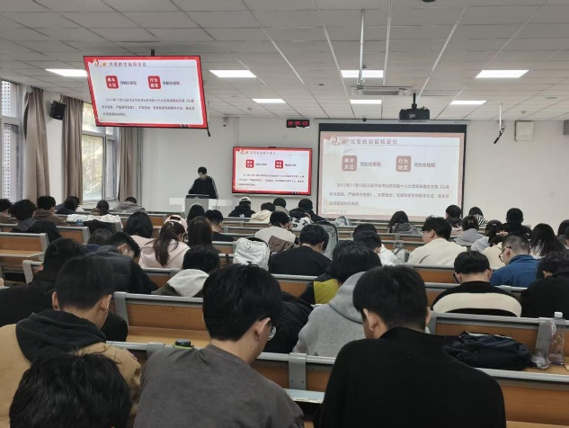 学生第三党支部书记韩烨讲授《严明党的群众纪律、践行党的根本宗旨》专题党课,强调党风廉政建设,要求青年党员贯彻以人民为中心思想和群众路线,严守群众纪律,践行根本宗旨,强化廉洁自律意识,筑牢拒腐防变思想根基。学生第二党支部书记刘鹏以中国共产党章程为主题,深入解读党章条文与党员职责,助力青年党员在学思践悟中筑牢信仰之基、把稳思想之舵。学生第一党支部委员张纳川为学员们带来《认真学习党史、新中国史,接好新时代“接力棒”,走好当代人“长征路” 》专题党课。学生第四党支部党员苏家炜以围绕党的二十届三中全会精神的核心部署与精神内涵进行解读。