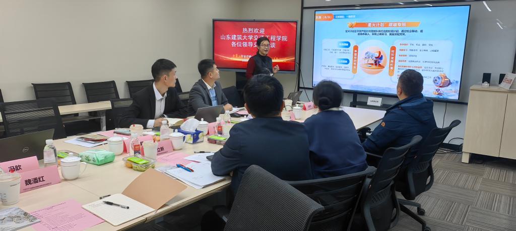 随后,双方共同观看了山东建筑大学宣传片,直观感受学校的办学理念、发展成就与育人特色。张立新详细介绍了学校的发展沿革、学科建设优势、科研创新能力,以及交通工程学院的专业设置、师资队伍结构、实验室硬件条件、科研成果转化成效和毕业生就业质量等情况。他强调,此次走访是落实学校“访企拓岗促就业”专项行动的重要举措,也是深化校企合作的关键一步,为双方后续推进产教融合奠定了坚实基础。希望以此次交流为契机,充分发挥高校在人才培养、科研创新、智力支持等方面的优势,结合企业在产业资源、实践平台、市场需求等方面的独特特长,在科研项目联合攻关、实验室资源共享、科技创新成果转化、学生实习实训基地建设、就业创业指导等多个领域开展务实合作,构建“校企协同、双向赋能”的合作新模式。