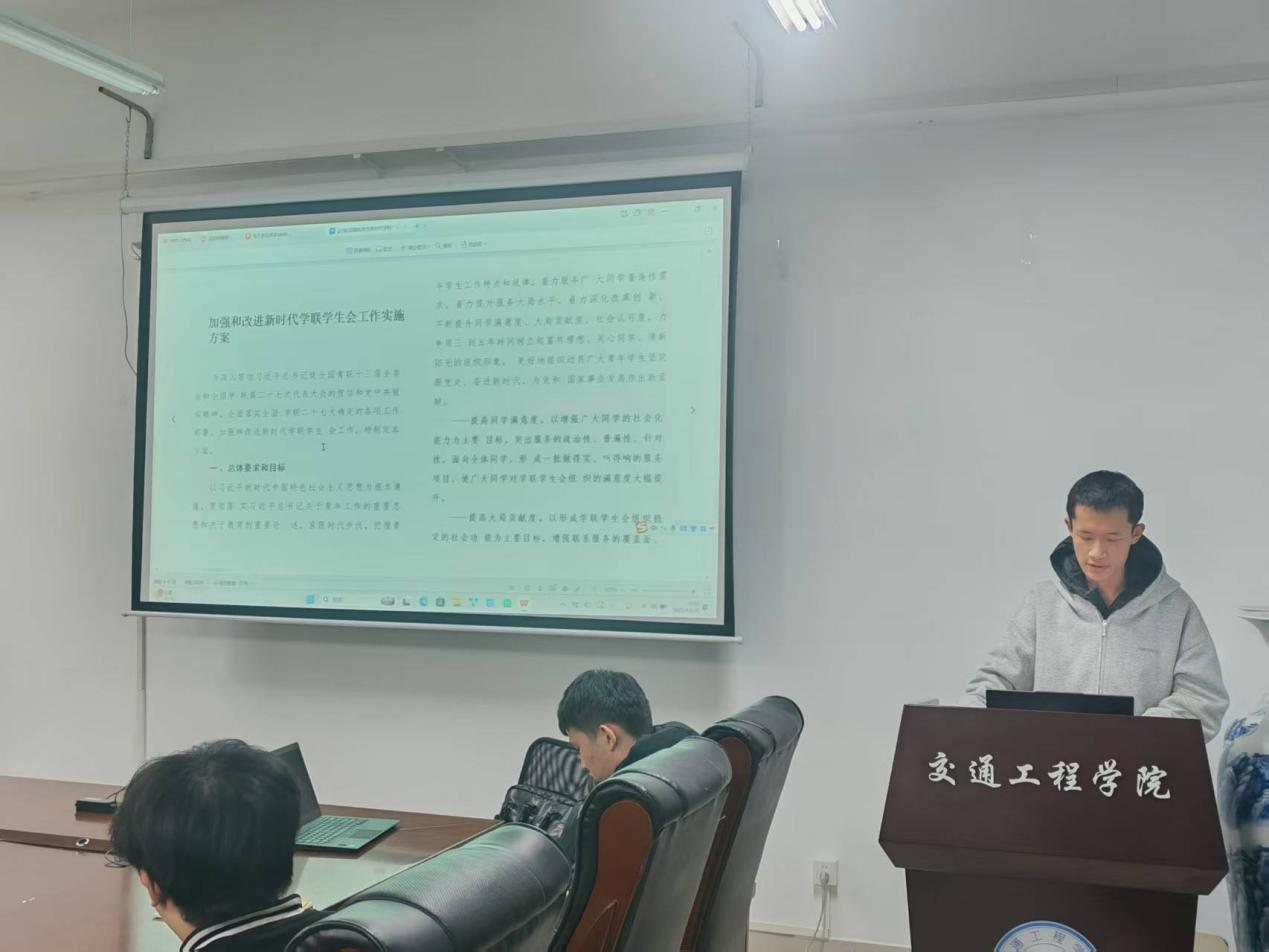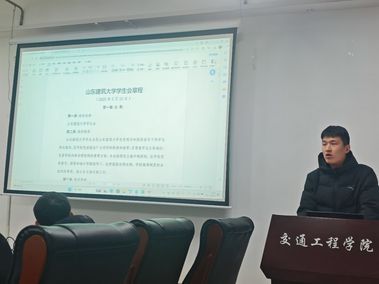 常磊同学依据《山东建筑大学学生会章程》全面介绍我院学生会指导思想、组织架构、运行模式、工作职责等,使全体成员,尤其是新晋干事,对我院学生会的整体情况与规章制度有了系统清晰的认识。潘奕扬同学领学了《关于推送高校学生会(研究生会)深化改革的若干意见》,带领同学们深刻领会学生会组织深化改革的必要性与方向,重点解读了学生会组织坚持“全心全意为同学服务”的根本宗旨,以及如何更好地发挥桥梁纽带作用;王天灏同学领学了《加强和改进新时代学联学生会工作实施方案》,为我院学生会更好地聚焦主责主业、服务同学成长奠定了坚实的行动基础。
