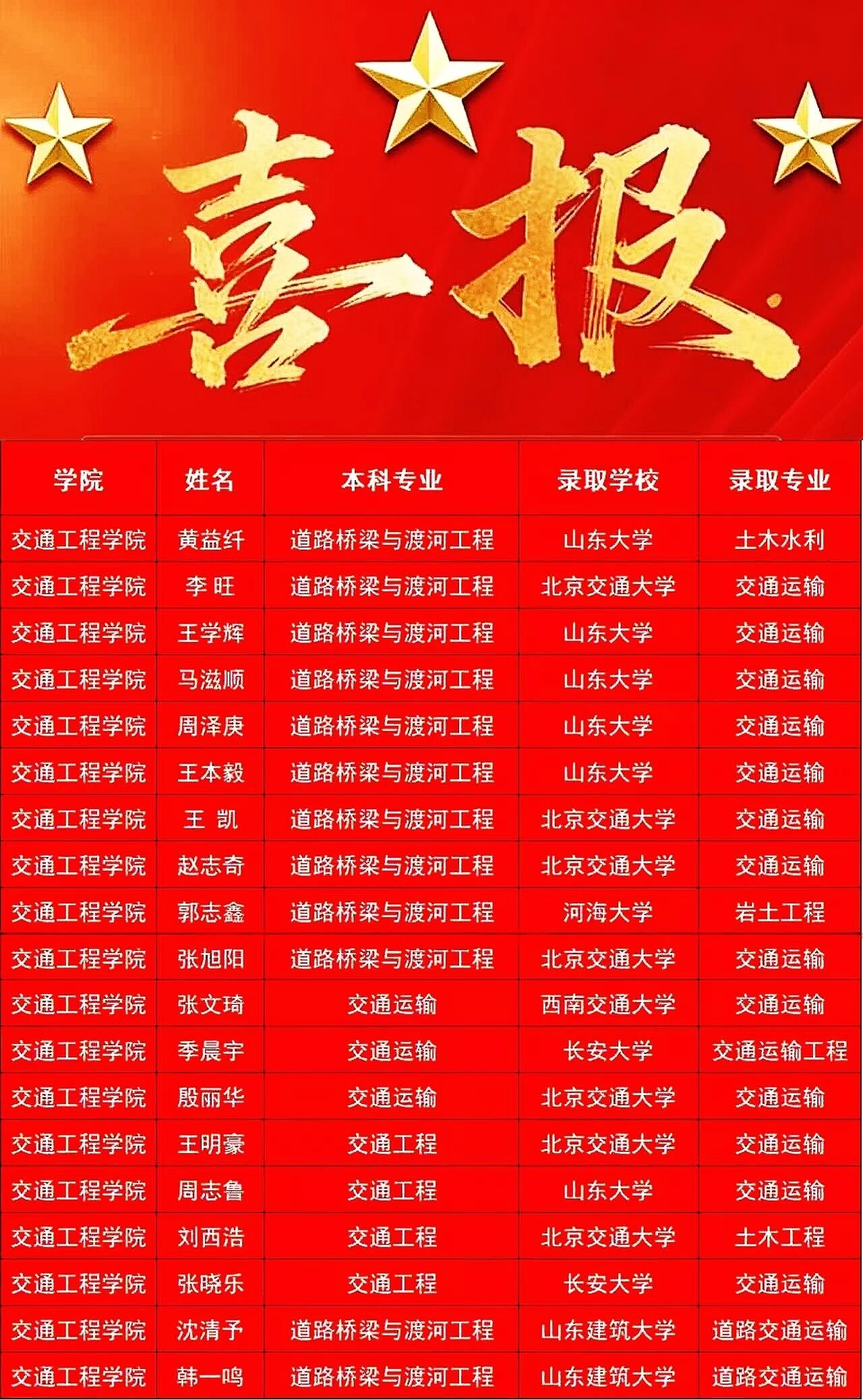 2026届优秀应届本科毕业生免试攻读研究生遴选工作圆满落幕。山东建筑大学交通工程学院学子凭借扎实的专业功底与突出的综合素养,历经层层选拔,成功斩获推免资格,即将奔赴国内高水平高校开启学术新篇。在此,向所有成功上岸的优秀学子致以最热烈的祝贺!