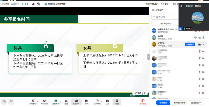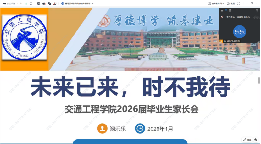 1月25日晚,交通工程学院通过线上会议形式,组织召开了2022级本科生家长会暨寒假就业促进会。会议旨在向家长通报学生学业、就业情况,凝聚家校共识,共同助力2026届毕业生顺利就业、稳步升学。学院辅导员阚乐乐、王浩镔,200余名家长共同参会。会议还特别邀请了学工部征兵工作负责老师蔡明越作专题分享。