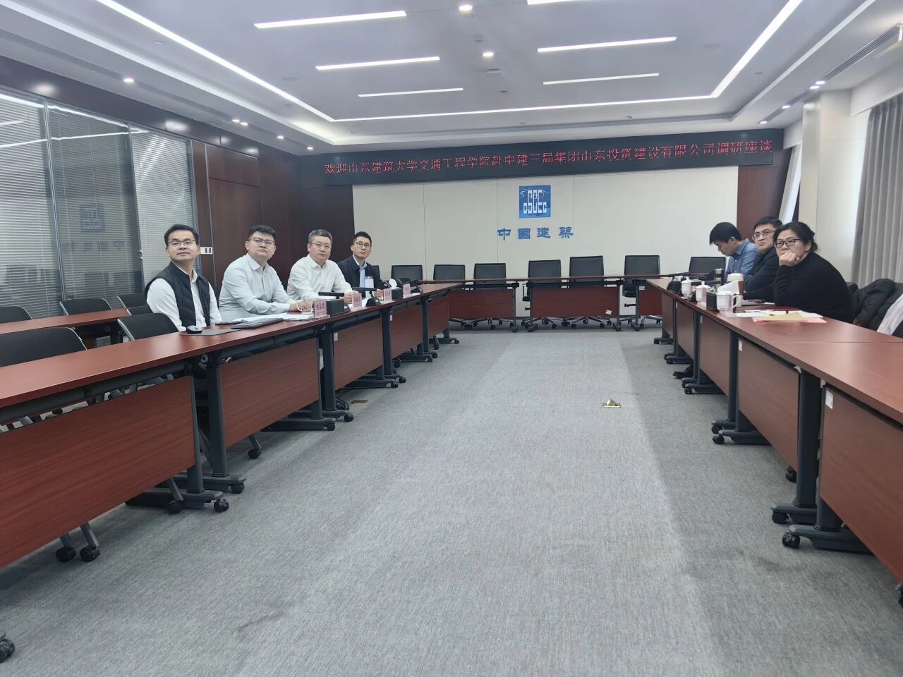 首先,与会人员共同观看了校企双方宣传片,进一步加深彼此了解。座谈会上,迟振涛对张立新一行的到来表示热烈欢迎,并详细介绍了中建三局集团山东投资建设有限公司的发展历程、组织架构、核心业务与行业布局。他指出,公司与山东建筑大学前期已联合开展多个项目合作,众多优秀建大学子毕业后加入企业,成为推动公司发展的重要骨干力量,校企双方具备坚实的合作基础与广阔的合作空间。迟振涛表示,希望以此次座谈为契机,依托交通工程学院优势学科资源,在科技研发、成果转化、人才联合培养等领域进一步深化合作,实现优势互补、互利共赢,共同助力行业高质量发展。