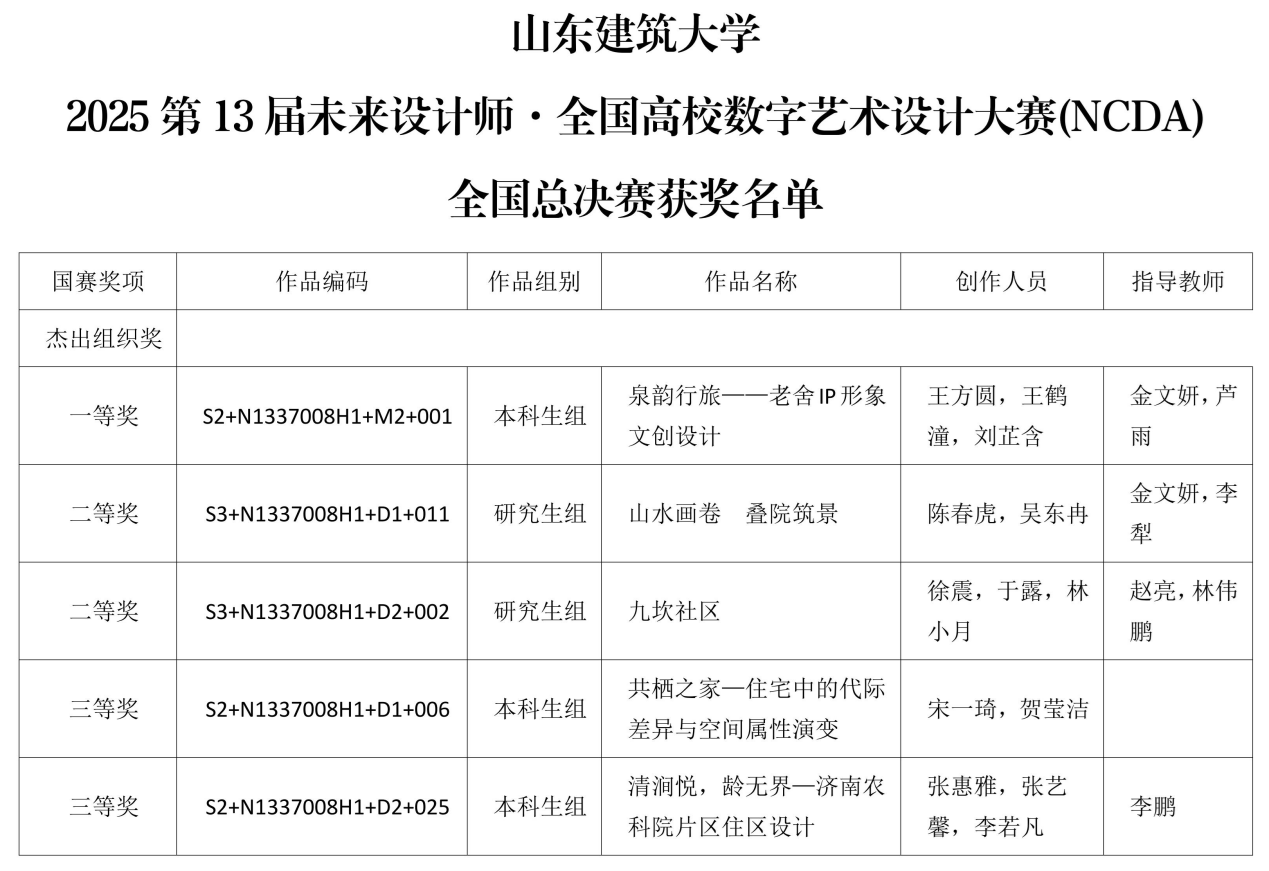 近日,2025第13届未来设计师・全国高校数字艺术设计大赛(NCDA)山东赛区及全国总决赛结果相继公布。山东建筑大学建筑城规学院师生喜获全国总决赛奖项5项,其中一等奖1项、二等奖2项、三等奖2项。省赛阶段共获41个奖项,其中包含一等奖11项、二等奖13项、三等奖17项。此外,学院教师获得多项“优秀组织教师”及“优秀指导教师”,山东建筑大学荣获“优秀组织奖”。