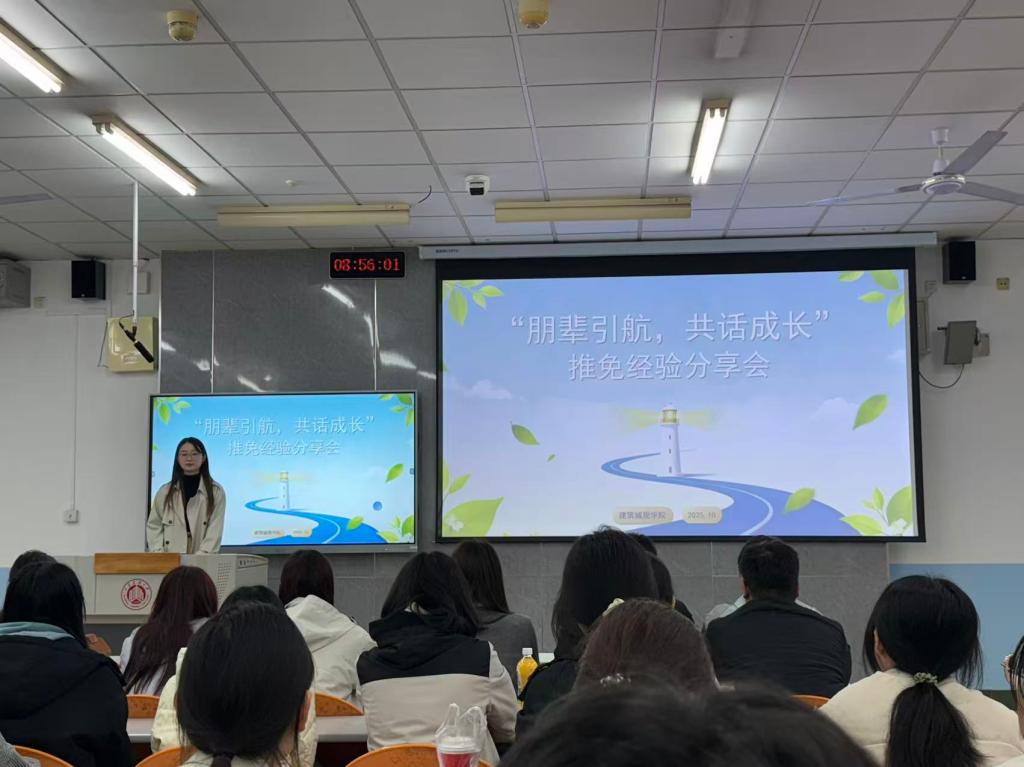 崔璨同学结合自身经历,系统梳理了推免政策的核心要点,并针对建筑城规专业的学科特点,分享了她在课程学习、竞赛参与、科研实践等方面的经验。本次讲座聚焦于大学生涯规划和职业发展的长远视角,在谈到大学规划时,崔璨为新生们提出了分阶段的发展建议:大一侧重适应与探索,打好专业基础,广泛参与校园活动;大二大三则应深化专业学习,积极参与学科竞赛与项目实践,提升综合能力;大四大五阶段需明确发展方向,为升学或就业做好充分准备。她鼓励同学们尽早树立目标,合理规划时间,在勤奋学习中不断成长。