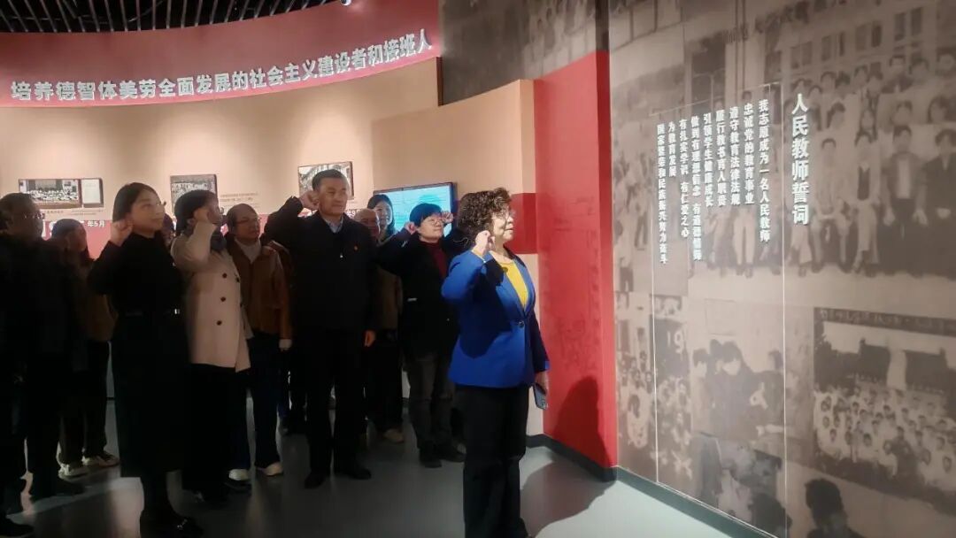 在中国教师博物馆,老师们重点参观了“山东省‘杏坛之光’师德楷模风范展览”。展览通过多媒体交互技术,生动展现了40位齐鲁教育工作者践行教育家精神的感人事迹。尤为引人注目的是,学院崔艳秋教授作为展览人物之一,其39载春秋坚守育人初心的感人事迹,让在场每一位教师无不为之动容,深刻感受到教育工作者矢志不渝的精神力量。随后,循着我国教育发展的历史脉络,老师们依次参观了“教师的历史”“教师的摇篮”“教师的典范”等核心展区。通过博物馆珍贵的文物史料、生动的图片和互动体验,系统了解了中国教育从古代私塾到现代教育的演进历程,深刻感悟了一代代教育家“躬耕教坛、强国有我”的责任与担当。最后,在庄严肃穆的宣誓厅,崔艳秋教授带领全体教师重温人民教师誓词,铮铮誓言彰显杏坛初心。