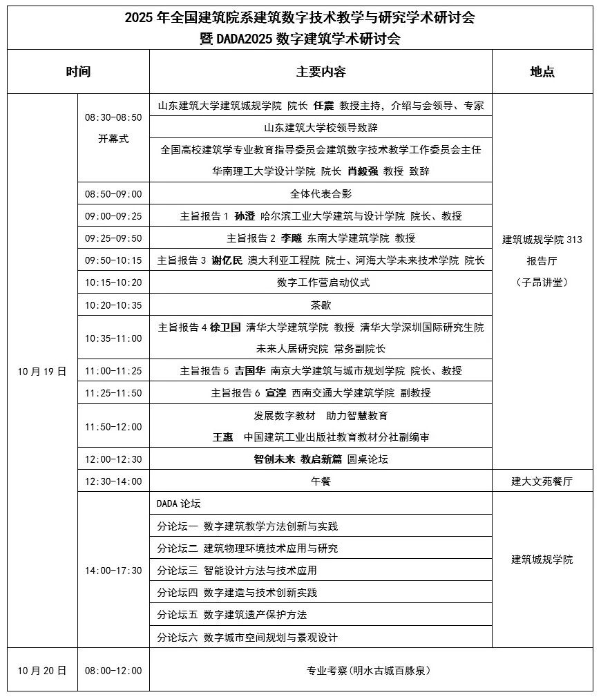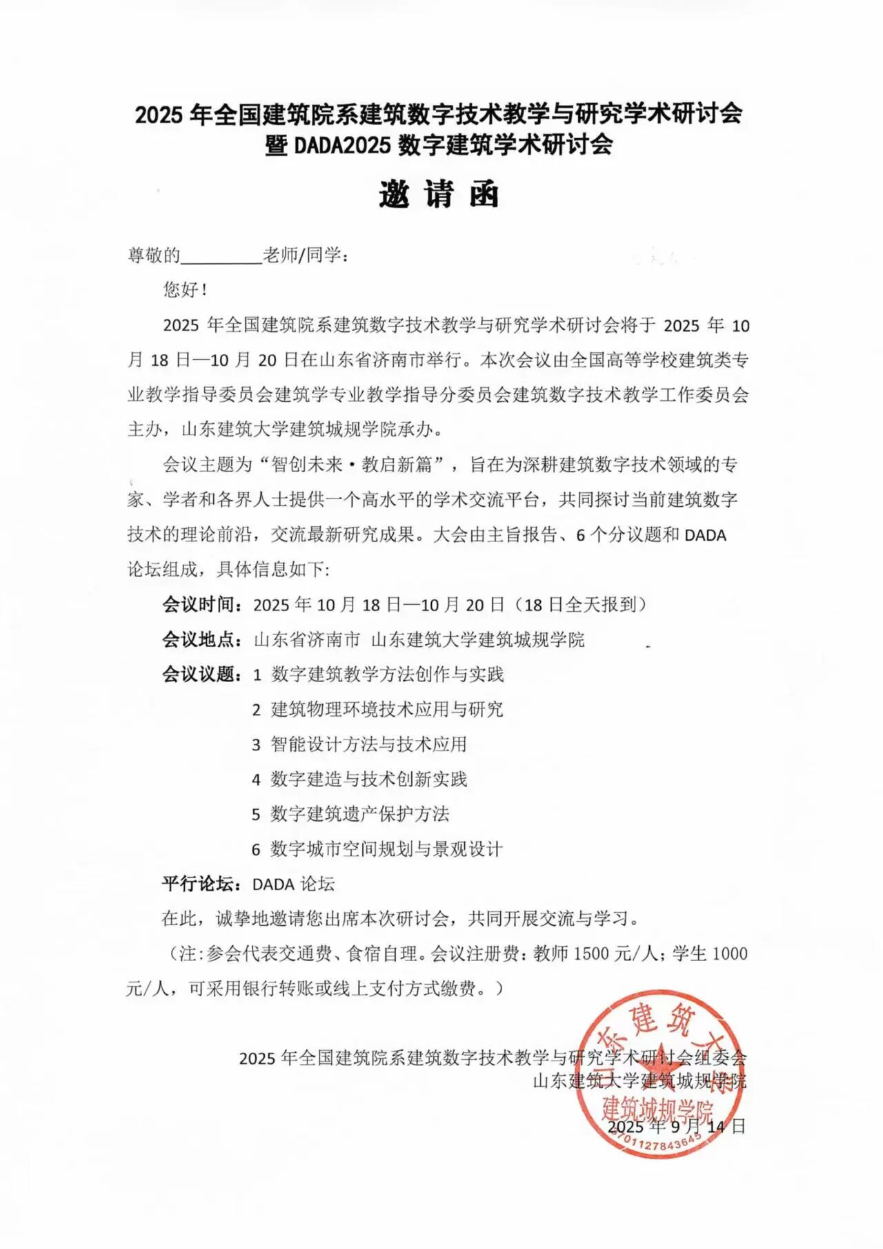 由全国高等学校建筑类专业教学指导委员会建筑学专业教学指导分委员会建筑数字技术教学工作委员会主办,山东建筑大学建筑城规学院承办的2025年全国建筑院系建筑数字技术教学与研究学术研讨会暨DADA2025数字建筑学术研讨会预计于2025年10月18日至20日在山东济南举行。