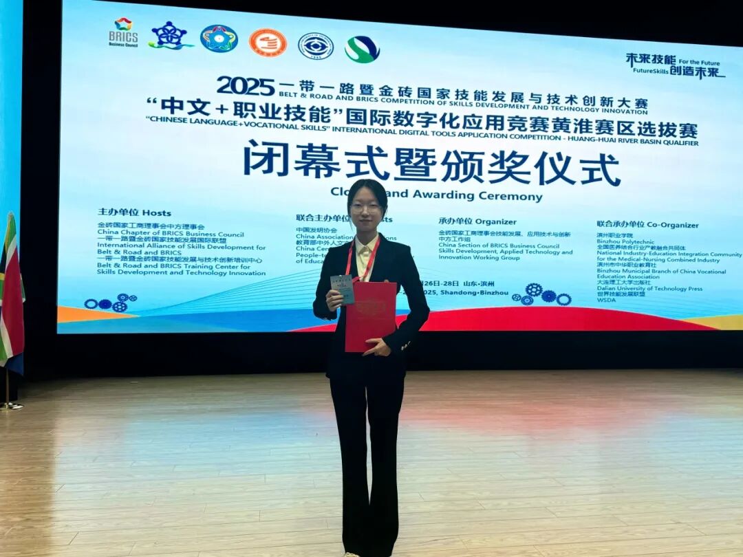 近日,2025一带一路暨金砖国家技能发展与技术创新大赛“中文+职业技能”国际数字化应用竞赛黄淮赛区选拔赛在滨州职业学院圆满落幕。由金文妍老师指导,我院22级建筑学专业本科生杨奕颖,凭借作品《以中文为笔,谱建筑诗篇》在激烈角逐中脱颖而出,荣获本科组一等奖并成功晋级全国总决赛。此次比赛本科组一等奖仅设2项,我校斩获其一,充分彰显了该奖项的稀缺性与高含金量。该作品立足其“建筑媒体专员”的职业理想,通过多个跨文化传播场景,生动阐释了中文在跨文化建筑交流中作为专业媒介的不可替代价值。