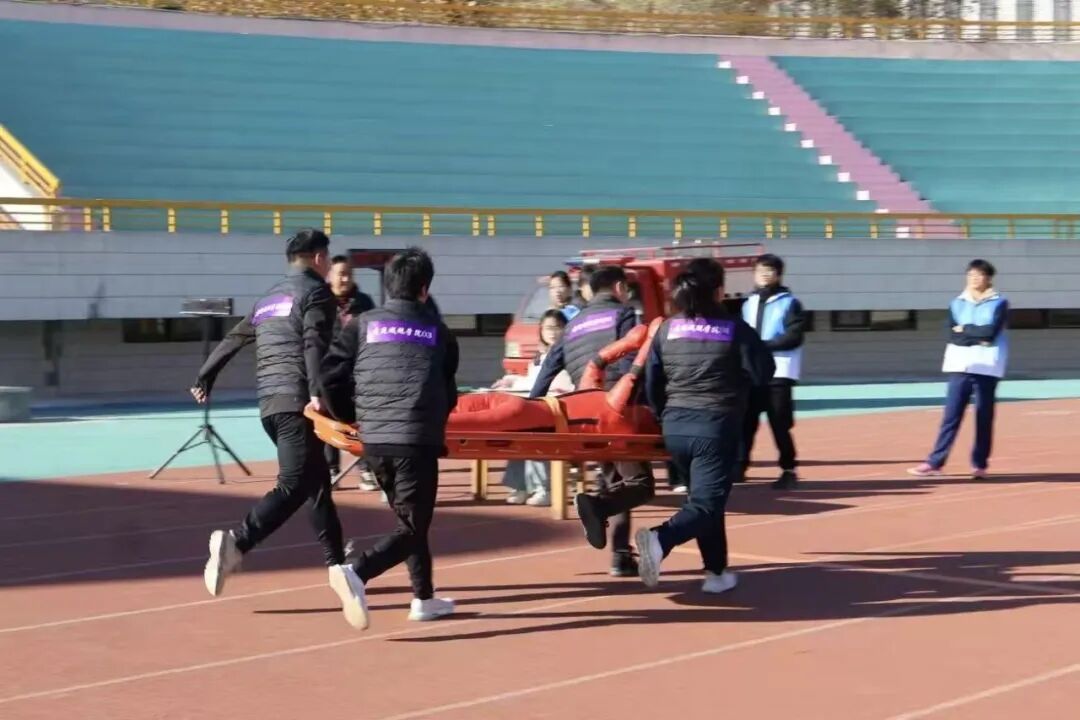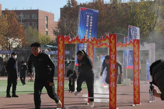 本次赛事紧扣“全民消防 生命至上”主题,由济南市历城区消防救援大队指导,设置了“穿越火线”“烈焰攻坚”“急救生命线”等贴合校园安全场景的项目。发令声响,学院四名队员从起点迅疾起跑,奔赴各赛段;模拟起火区域内,他们规范操作灭火器具,动作利落且步骤严谨;应急救援环节里,他们协作配合,平稳迅捷地完成假人转移,最终高质量完成全部考核科目,展现了过硬的专业素养与昂扬的精神风貌。