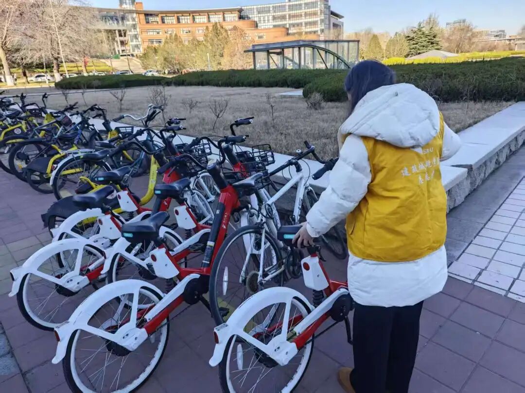 保障空间有序,弯腰践行担当,建院志愿者聚焦建艺馆周边车辆停放痛点。忙碌的身影成为校园晨光中最动人的风景,志愿者们坚守岗位,以建院学子特有的“空间秩序感”,将随意停放的非机动车一一移至规范区域,摆放整齐。