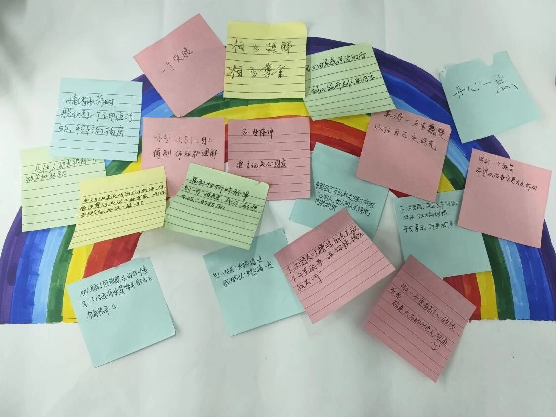 活动伊始,“缘来有你”破冰环节引导学生通过击掌、微笑等非语言方式相互问候,迅速缓解拘谨氛围,实现初步联结与互动预热。随后的团队组建环节以民主推选、共创队名与队旗为核心,有效激发团队认同,增强成员归属感与协作默契。在“我的沟通秘诀”环节中,活动负责人通过动作示范讲解萨提亚五种沟通模式,学生积极参与模仿与体验,深化对不同沟通方式对其心理影响的理解。最后,“我的人际能量贴”活动,组织学生在“人际彩虹桥”上书写支持期待与改变承诺,并在组内分享交流,将整场氛围推向高潮,显著提升参与者的归属感与互助意识。