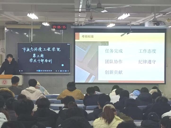 最后,学生会主席团成员王子轩以“考核赋能成长,担当点亮青春”为主题进行讲解,让大家明确学生干部考核条例及考核标准。并且,王子轩用“任务完成 工作态度 团队协作 纪律遵守 创新贡献”总结学生干部考核标准,激励2025届全体干事向上向好发展。