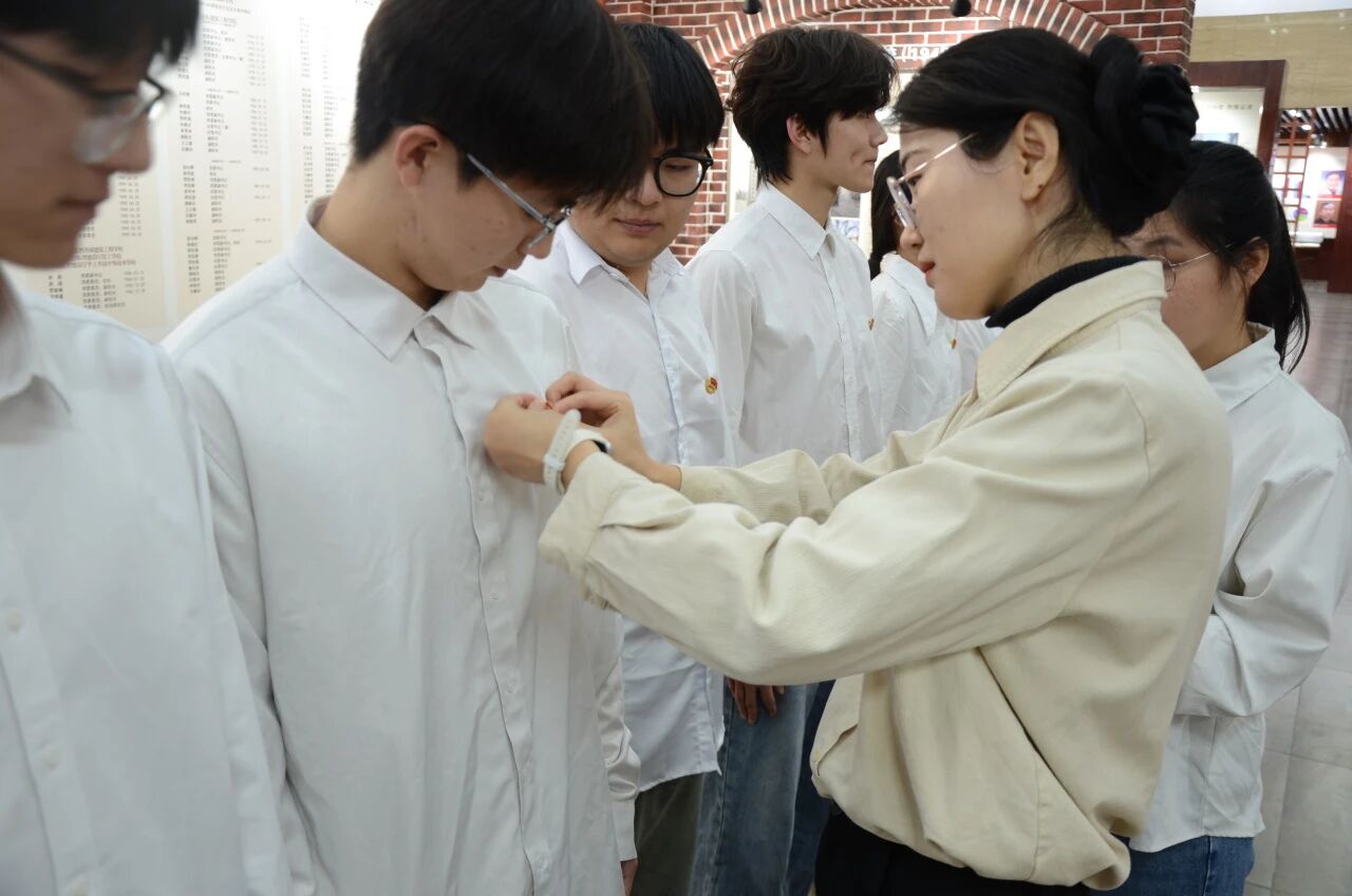 活动在庄严的国歌声中拉开序幕,全体人员目光坚定,心中充满了对祖国的热爱与敬仰。主持人宣读2025年第二批新发展团员名单,这些新面孔将为学院共青团工作注入新的活力与希望。寻芬为新发展团员代表佩戴团徽,小小的团徽别在胸前,不仅是共青团的标志,更承载着“为他人着想、为集体担当”的责任。随后,生物241团支部董哲慧作为领誓人,在其带领下全体团员进行了庄严的宣誓。誓言中,他们表达了对共青团组织的忠诚与热爱,以及对未来工作的决心与信心。宣誓的声音回荡,激励着每一个人。宣誓结束后,生物242团支部陈星宇和水工244团支部团支书宋亚轩分别作为新老团员代表进行了发言。