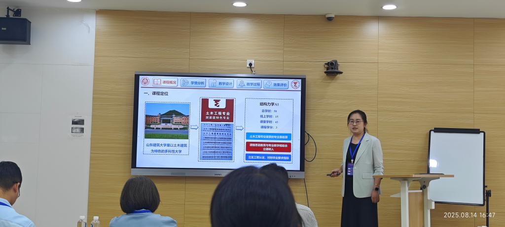 研讨会期间,举办了全国土木工程专业青年教师说课竞赛,共有来自全国各高校的100余名青年教师同台竞技。青年教师丁婧楠以我院国家一流本科课程《结构力学A1》为例,围绕“AI+混合式”教学模式和课程思政建设,系统介绍了融合力学知识、数字化技术、多模态资源和工程实践创新的“1体系-2模块-3场景-4阶段”教学方法,展示了我院在土木工程教育数智化与行业转型升级背景下的教学创新与成果,最终获得说课竞赛三等奖。