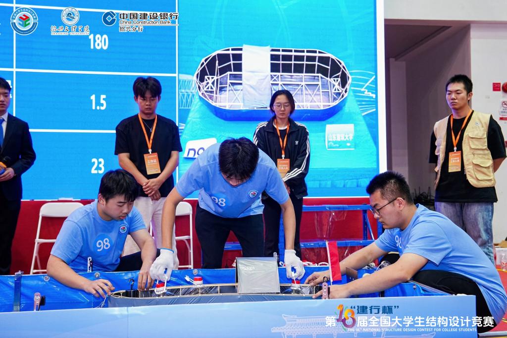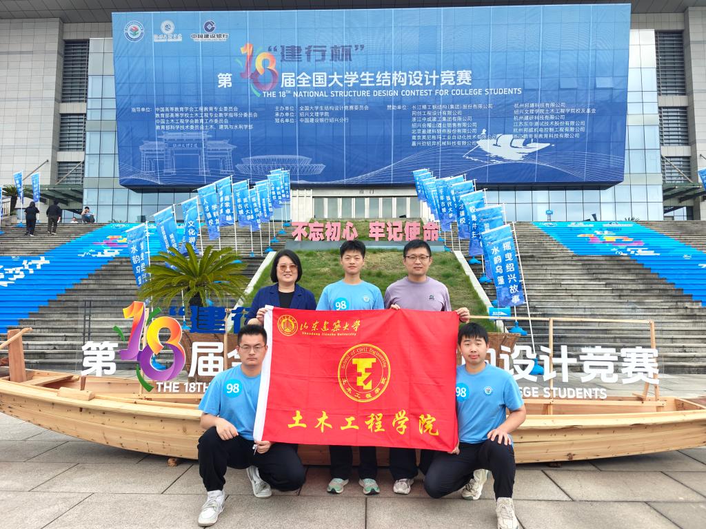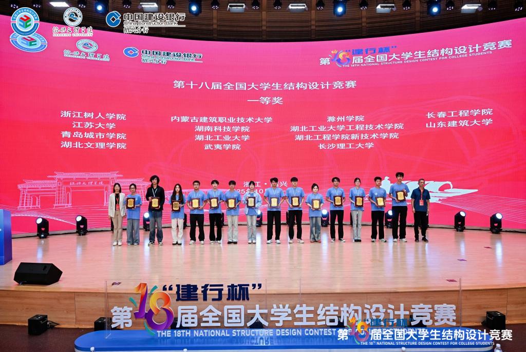 2025年10月16日下午,“建行杯”第十八届全国大学生结构设计竞赛全国总决赛在绍兴文理学院拉开帷幕。来自清华大学、浙江大学、同济大学等全国119所高校的120支队伍齐聚绍兴,同台竞技。经过了激烈的比拼,由土木工程学院曲爽老师和孙士儒老师带领的踏浪队(孙国民、包熙豪、栾志扬)脱颖而出,荣获全国一等奖。省赛表现优异的另一支由土木工程学院曲爽老师和孙士儒老师指导的队伍争渡队(王禄玺、李宝坤、刘同锁)获得全国三等奖。此成绩为历年来我校全国大学生结构设计竞赛的最好成绩。