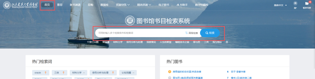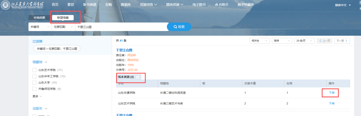 2.图书检索:点击“首页”,在“检索”框输入检索内容(图三),若我校馆藏无可借副本,再点击“联盟馆藏”,确定目标图书后,点击“纸本资源”,点击“下单”,选择“取书地”,点击“确认”(图四)。