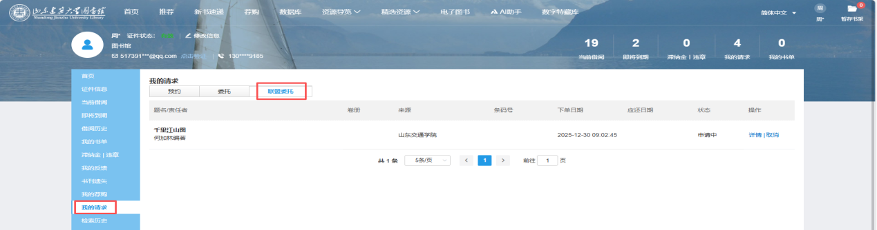 7.需要取消委托的,可以登录“我的图书馆”--“我的请求”--“联盟委托”中取消委托。